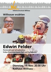 Edwin Felder war schon als Bub immer «gwonderig» Dieser «Gwonder» trieb den jungen Koch aus dem Restaurant Sonne in Willisau hinaus in die grosse weite Welt. Er lernte und lehrte an namhaften Institutionen und Hotelfachschulen, Food & Beverages sowie die Gesamtlogistik der Airline- und Bahngastronomie. «Ein Willisauer in Japan» war nicht länger nur ein geflügeltes Wort. An der Expo 1985 in Tsukuba, Japan, machte er die Schweizer Kulinarik dem internationalen Publikum schmackhaft. Nach seiner Pension wurde aus dem Koch ein Autor und Erzähler. «Mis ach so wunderbar verrockt schöns Läbe» – im Gespräch mit der Journalistin Chantal Bossard wird Edwin Felder aus seinem spannenden Leben erzählen bestärken und aufzuzeigen, wie wir sie als Einzelne und als Gesellschaft unterstützen können.