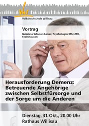 Angehörige von demenzerkrankten Menschen leisten unbeachtet viele Betreuungsstunden. Sie werden oft erst wahrgenommen, wenn sie als Folge der chronischen Überbelastung selber Krankheitssymptome entwickeln. Was hat diese Selbstüberforderung mit der Erwartungshaltung in der Gesellschaft zu tun? Was bedeutet es, wenn ein nahestehender Mensch an Demenz erkrankt? Ziel des Referats ist es, betreuende Angehörige in ihrer Selbstfürsorge zu bestärken und aufzuzeigen, wie wir sie als Einzelne und als Gesellschaft unterstützen können.