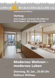 "Zuhause ankommen" - ein inniger Wunsch von uns allen, in einer immer hektischer werdenden Welt! Aber nicht nur unser Umfeld in Beruf und Freizeit ändert sich, ebenso ändern sich unsere Ansprüche an das Wohnen: Was für ein Zuhause wünschen sich Mann und Frau, welches unsere Kinder und jungen Erwachsenen heute? Wie lassen sich unsere Ansprüche mit Themen wie Nachhaltigkeit, Kreislaufwirtschaft, Raumplanung und Verdichtung vereinen? Das Architekten-Duo Helen und René Chappuis, bestens verankert in unserer Region, geben uns Einblicke in die Thematik, mit besonderer Berücksichtigung des Raumes Willisau.