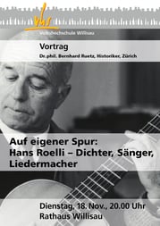 Dr. Bernhard Ruetz begibt sich auf die Spuren von Hans Roelli als Dichter, Sänger und Kurdirektor. Die Begrüssungsworte hält Prof. Dr. Theodor Abt, Präsident der "Hans & Margrit Roelli Stiftung". Dr. Matthias Senn rezitiert und singt Lieder aus dem Werk von Hans Roelli, Angelika Bauer begleitet auf der Gitarre.
