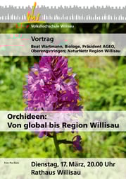 Auf der Welt gibt es rund 30 000 Orchideen-Arten - in allen Farben und Formen. Knapp 80 Arten gedeihen in der Schweiz und etwa zwei Dutzend in der Region Willisau. Der Vortrag entführt Sie in die komplexe Biologie dieser Königinnen der Pflanzen und zeigt, wie Orchideen ihre Bestäuber überlisten. Die in der Schweiz und regional typischen Arten werden vorgestellt und Massnahmen aufgezeigt, wie sie geschützt werden können. Erfreuen Sie sich anschliessend an Bildern unserer Orchideen, aufgenommen von vier lokalen Amateur-Fotografen.