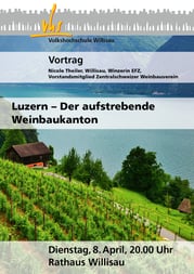 Der Weinkonsum pro Kopf in unserem Land nimmt ab. Die traditionellen Weinregionen in der Schweiz kämpfen mit Absatzschwierigkeiten. Trotzdem boomt der Weinkanton Luzern. Die Region widersetzt sich dem Negativtrend und kann in diesem schwierigen Umfeld mit ihren spannenden Weinen weiterhin Marktanteile gewinnen. Wie hat sich der Schweizer Weinbau in den letzten 100 Jahren entwickelt und warum kann im Herzen der Schweiz der Weinbau derart erfolgreich und zukunftsorientiert betrieben werden? Nicole Theiler nimmt Sie mit in die Welt des Weinbaus mit Fokus auf unsere Region – Verkostung von regionalen Weinen inklusive.
