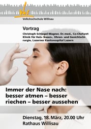 Die Nase verbindet Form und Funktion, wie wir es von der Architektur her kennen. Die Funktion steht im Vordergrund, stellt die Nase doch den vordersten Teil unserer lebenswichtigen Atemorgane dar. Der Riechsinn erlaubt uns, Gefahren wie einen Brand oder verdorbene Esswaren zu erkennen, aber auch uns von feinen Düften betören zu lassen. Daneben steht die Nase mitten in unserem Gesicht, und ihre Form beeinflusst unser Aussehen massgeblich. Im Vortrag wird auf die vielfältigen Funktionen der Nase eingegangen, die häufigen Krankheiten der Nase und der Nasennebenhöhlen werden besprochen, aber auch über den Sinn von ästhetischen Nasenkorrekturen wird diskutiert.