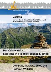 «Vom Talboden aus lösen die steilen Bergflanken Erstaunen und Bewunderung aus – oder sie können auch etwas einschüchtern… Die wilde und intakte Natur verschmilzt hier mit der traditionellen Kulturlandschaft zu einem harmonischen Ganzen», so beschreibt die Website des «Parco Val Calanca» den Charakter des italienisch sprachigen Bündner Tales, von dem jeder schon mal gehört, es aber wohl kaum besucht hat. Beim ersten Blick auf das Tal und seine Geschichte erscheint kein ungewöhnliches Bild: Einst weitestgehend autark, beginnen in der Neuzeit Prozesse der berufsbedingten, saisonalen Wanderung, mit Beginn der Industrialisierung schliesslich die endgültige Abwanderung. Aber bei genauerem Hinsehen entsteht das Bild einer faszinierenden Kulturlandschaft, in der der Mensch sich als Teil einer Natur empfand, die er gehegt und gepflegt hat im Bewusstsein, ein Teil von ihr zu sein. Dieses Erbe wird durch Einheimische und Idealisten gesichert und weitergeführt. Der Vortrag will eine Brücke schlagen zwischen Vergangenheit und Zukunft und zum Besuch dieses Kleinods anregen. Am Vortragsabend wird auch über eine mögliche Exkursion ins Tal informiert.